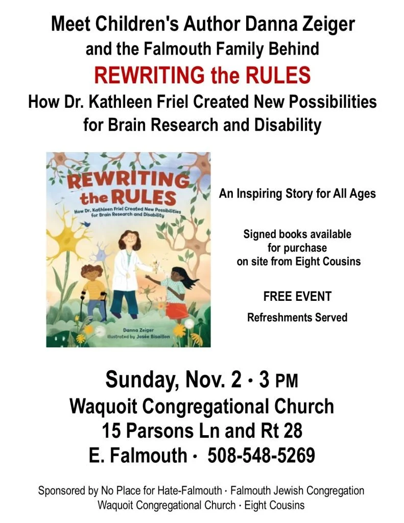The Waquoit Congregational Church in partnership with Falmouth Jewish Congregation, No Place for Hate, and Eight Cousins Books will host an author talk with Danna Zeiger, on Sunday, November 2 at 3 p.m. The event is free and open to everyone. Click here for more information.